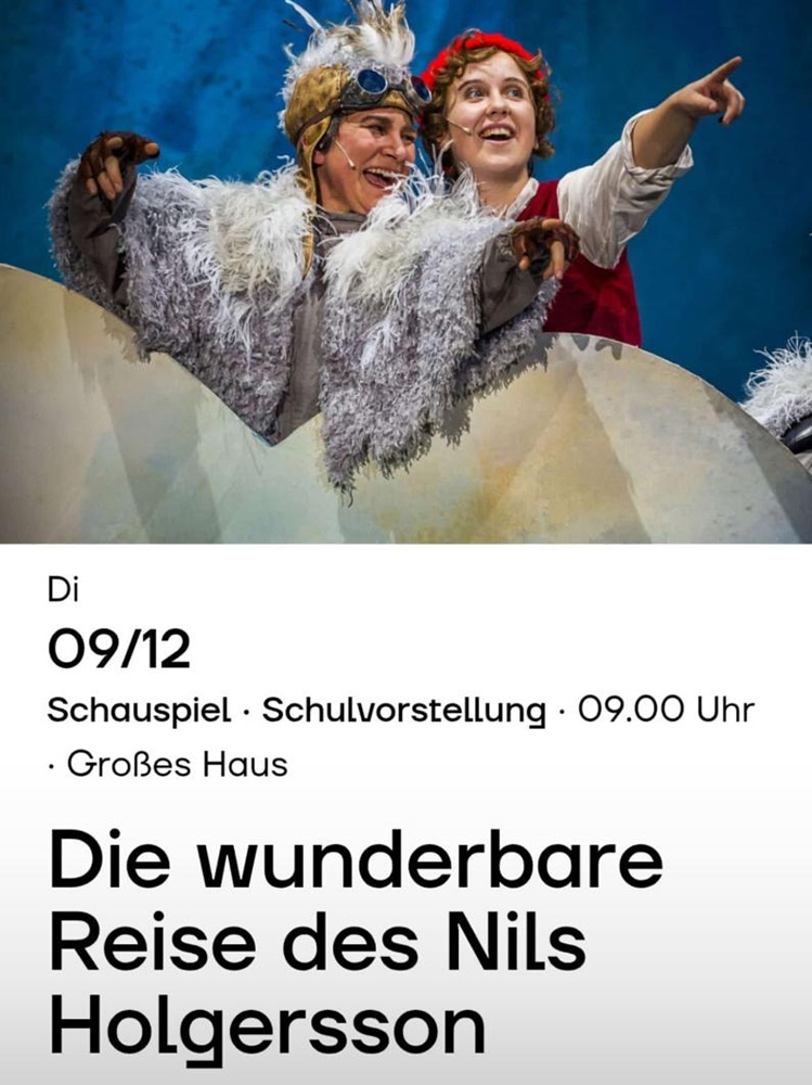 In diesem Schuljahr fuhren wir am 09.12.2025 ins Theater zu Lübeck. Dort nahmen uns ein fantastisches Bühnenbild, einzigartige Schauspieler und Schauspielerinnen sowie orchestrale Musik mit auf "Die wunderbare Reise des Nils Holgersson". Die Reise führt den jungen Nils mit seiner Hofgans Martin und einem Wildgänseschwarm unter der Führung der weisen Gans Akka von Kebnekajse durch ganz Schweden, wo er Gefahren meistert und Freundschaften schließt. Gespannt verfolgten unsere Kinder die Geschichte um Nils, Martin und die wilden Gänse.